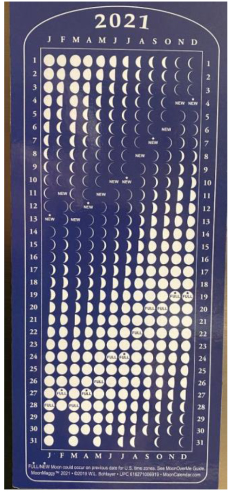 When the various moon phases (new, crescent, quarter, gibbous, and full) move from one into the next, they are easily identified by whether the moon appears larger or smaller from the previous day or night. Thus, a waxing (growing) crescent would appear right to center while a waning (diminishing) crescent would be seen to the left. It can be habit forming to observe the phases. When charted alongside their corresponding dates, a beautiful symmetry unexpectedly appears. “Moon charts” in their simplistic beauty inspire the imagination and deepen the wonder of genesis and all that has been set in motion.