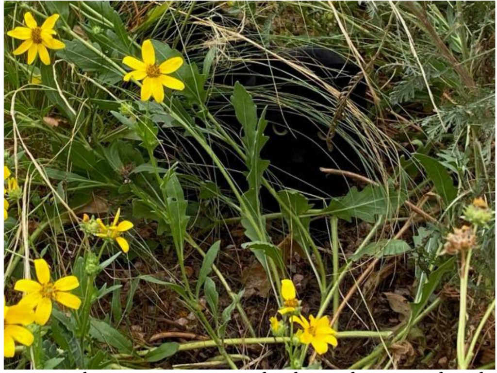 Summer gardens are in their prime. In our case that means lots of yellows to contrast with the raucous carefree colors of potted petunias and other mainstay annuals that help balance our mature garden. Mornings are a time of exploration for our animals as they relish the cool dawn hours before the heat sets in. In particular there is one coal black feline friend whose yellow eyes are the only giveaway to her presence as she explores each new day. She often surprises by being right in front of us while cleverly blending into the foliage.