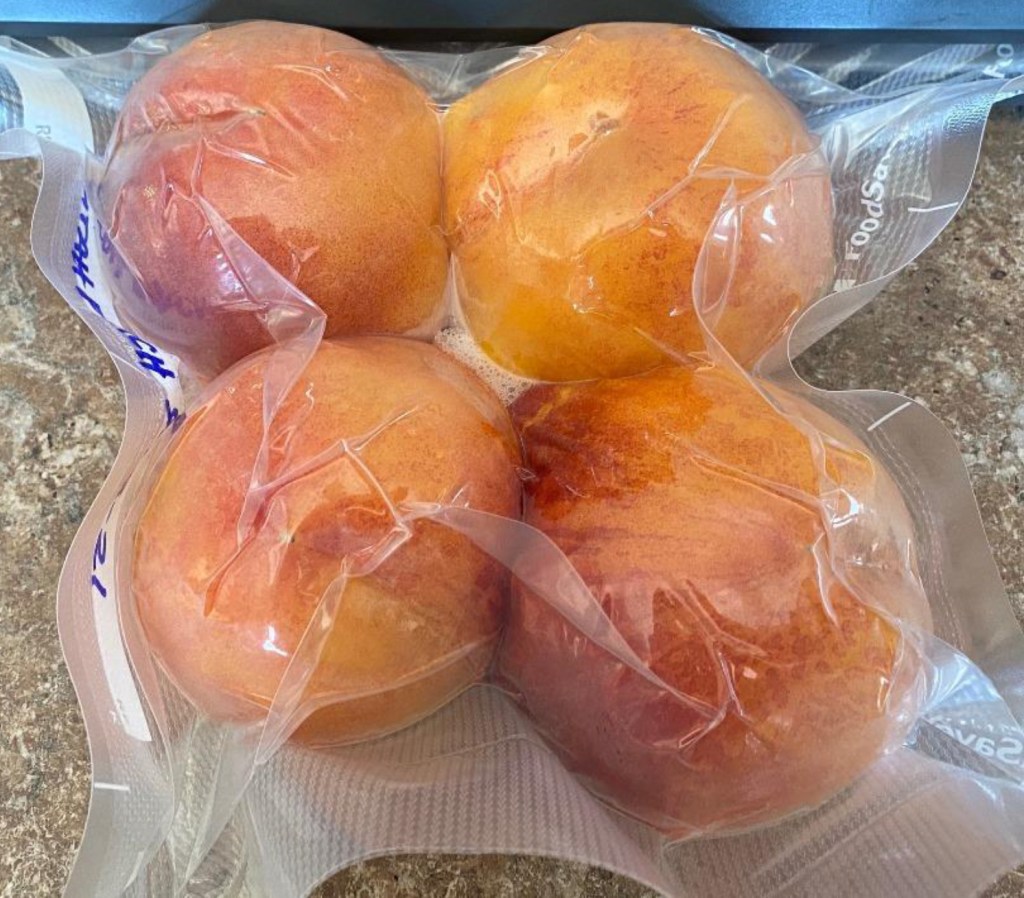 A vacuum sealer comes into play as peaches are cleaned and dried, then pre-frozen for a couple hours so they retain their form in the vacuum sealed bags. When allowed to thaw for use during subsequent months, the skin slips off the peaches in easy fashion and all is well for the making of untold peach cobblers.