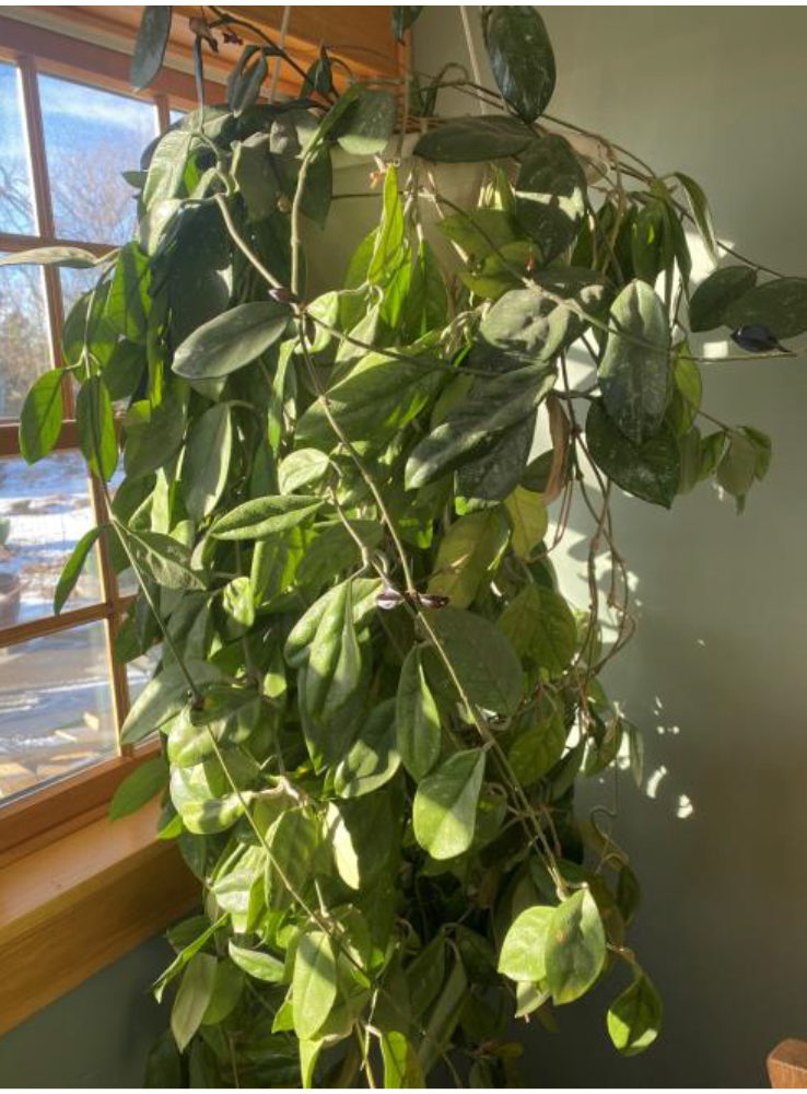 It is a Hoya plant with long trailing shoots and waxy leaves that keep it alive during times of stress and drought. Oft times that drought is weekly in nature as the Hoya gets ignored until it is bone dry. Each new infusion of water works miraculously to revive it, renewing its lease on life for yet one more stretch of time. There is appreciation for the tenacity that it has shown over the years through better than a dozen moves and multiple growing situations where temperature and light were at a premium.