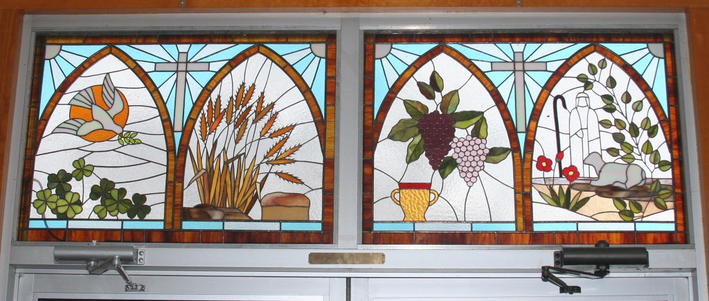 In 1952, Jessie (Whitney) Scott, who became a member of the Haxtun Church Of The Brethren as a young girl, painted a life-sized picture of Christ knocking at “Heart’s Door” and gave it to her congregation. The oil painting continues to hang at the front of the sanctuary. Jessie later crafted a stain-glass back for a worship center and, in 1989 the Switzer family began a tradition of commissioning Jessie’s stain-glass windows when they ask her to create four panes in memory of Merle and Ola Switzer to set above the door at the east entry of the church.