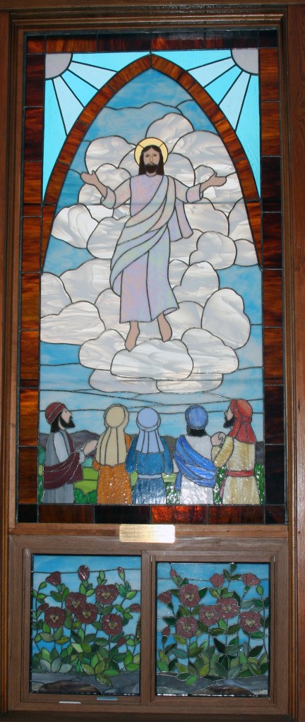 The eighth and final window, shown below, which is located in the vestibule was created in 1999 in memory of the John and Della Whitney and Arch and Sophie Scott families. It depicts Christ’s Ascent into Heaven.