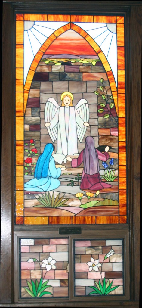 Ruby Heaston and family commissioned the first window, shown at right, which was completed in 1995 in memory of Ruby’s husband Fred who died on Good Friday in 1994. The window depicts the women at the tomb witnessing Christ’s resurrection.